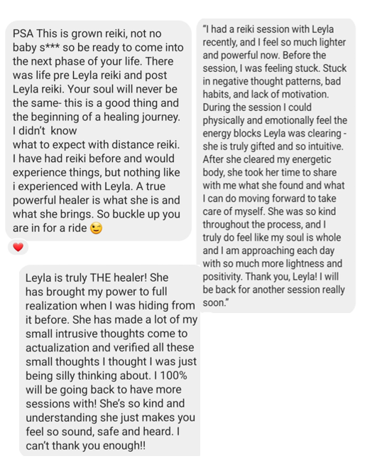 Then, Leyla will conduct 45 minutes of reiki energy healing on you via Zoom. She will move negative stuck energy in the body and aura and cleanse your energy. And while she is doing this, she will receive messages from your spirit team on how to move forward in your life.